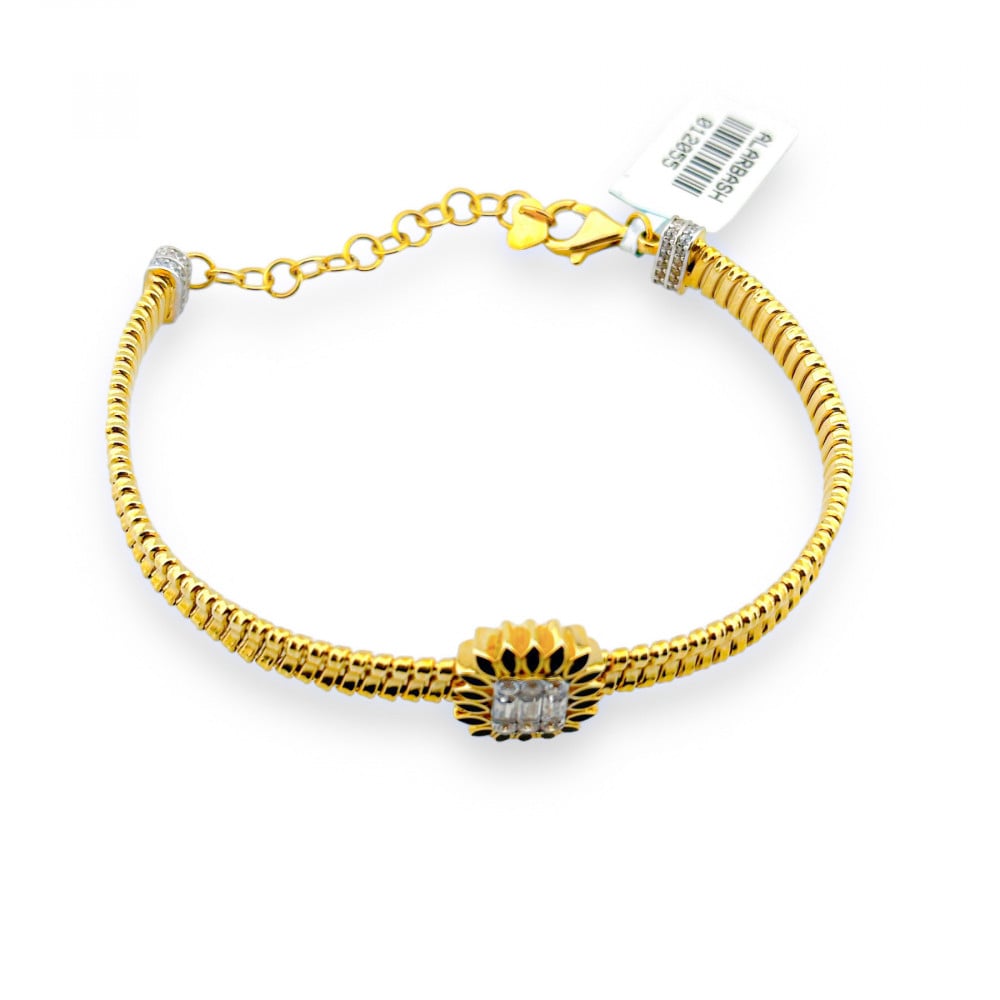 تتميز الاسورة بلون الذهب اللامع الذي يعكس الضوء بشكل رائع، مما يضفي عليها لمسة من الجمال. تم تصنيعها من مواد عالية الجودة، حيث يظهر اللمعان الدائم للذهب عيار 18، مما يعكس الحرفية العالية في صنعها. التصميم الأنيق ذو الحواف المنحنية يجعلها مريحة عند ارتدائها، بينما تضيف الزخرفة المميزة في المنتصف لمسة من الرقي.