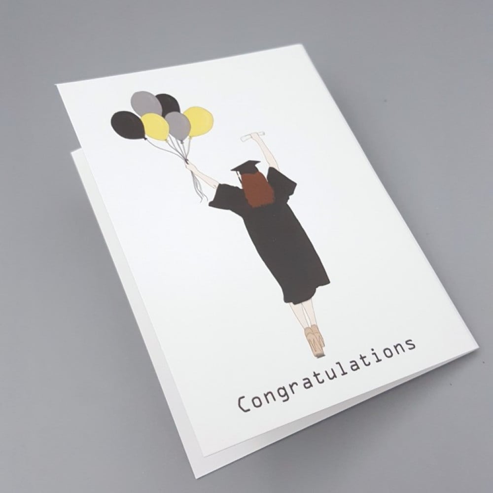 تأتي البطاقة بتصميم بسيط وأنيق، حيث تظهر شخصية ترتدي قبعة التخرج وتحمل بالونات ملونة بألوان زاهية مثل الأسود والرمادي والأصفر. هذه الألوان تضيف لمسة من الحيوية والبهجة، مما يجعل البطاقة تبرز بين الهدايا الأخرى. كما أن الورق المستخدم في صنع البطاقة ذو جودة عالية، مما يمنحها ملمسًا ناعمًا ومتينًا، ويعكس الحرفية العالية في التصنيع.
