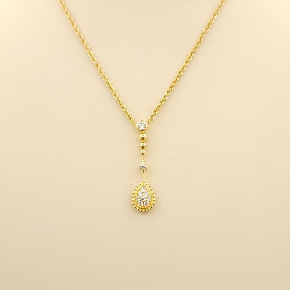 تتميز التعليقة بلونها الذهبي اللامع، الذي يضفي لمسة من الفخامة على أي إطلالة. تم تصميمها من معدن الذهب عيار 18، مما يضمن لك جودة عالية ومتانة تدوم طويلاً. الشكل المنحني للتعليقة مع تفاصيلها الدقيقة تجعلها جذابة للنظر، حيث تتدلى بشكل أنيق من السلسلة المتينة.