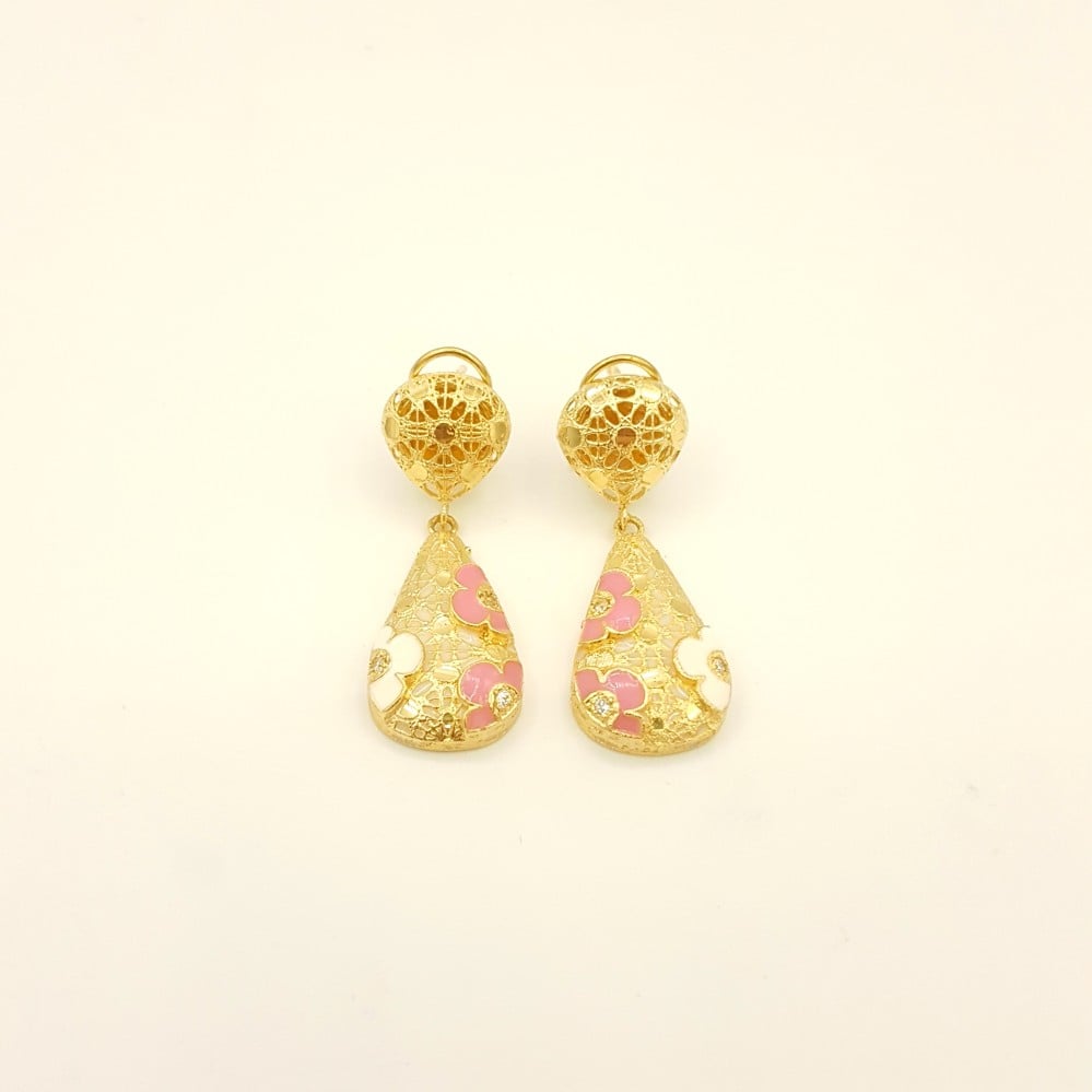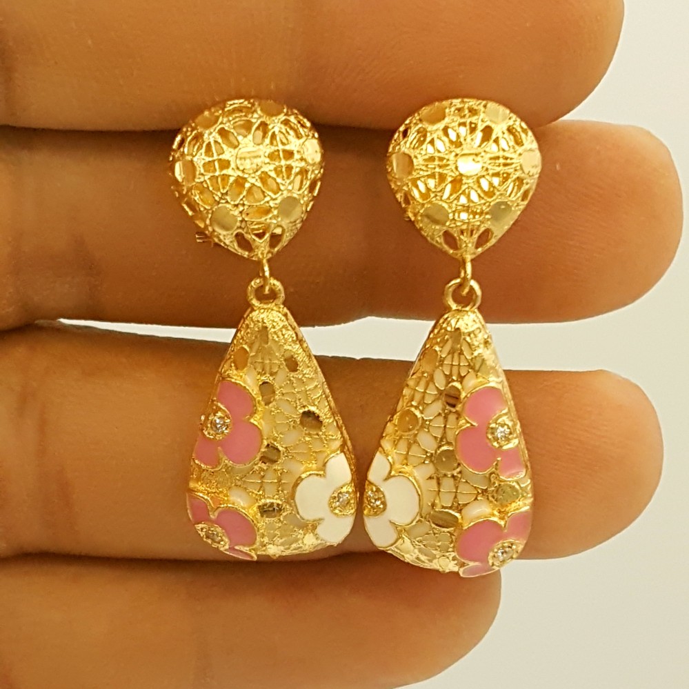 تتميز الأجزاء العلوية من الحلق بتفاصيل دقيقة من الذهب، مع تصميم شبكي يضيف لمسة من الفخامة. الجزء السفلي يأتي بشكل قطرة مزخرفة بألوان زاهية، حيث تتداخل الأزهار الوردية مع لمسات من اللون الأبيض، مما يجعله قطعة فنية تبرز جمالك. يُظهر الحلق لمسة من الإبداع والابتكار، حيث يمتزج التصميم التقليدي مع لمسات عصرية.