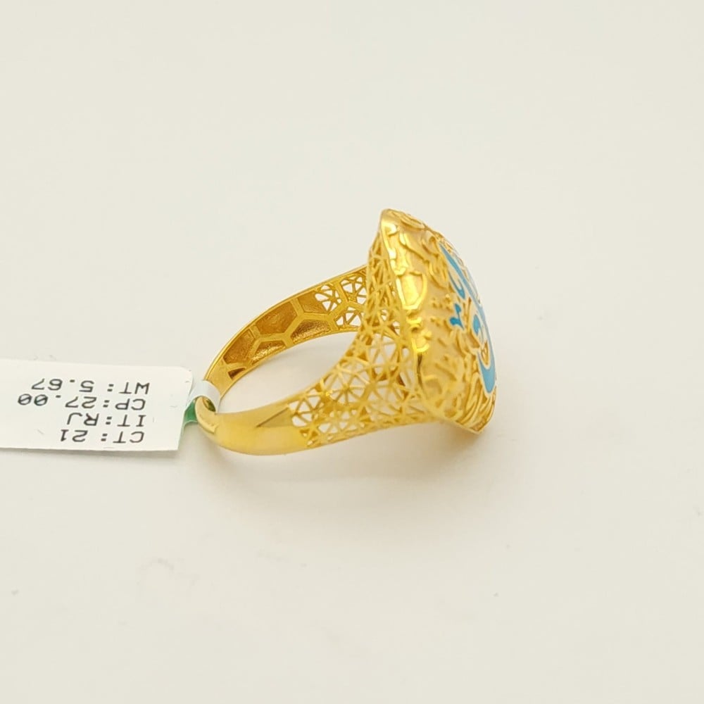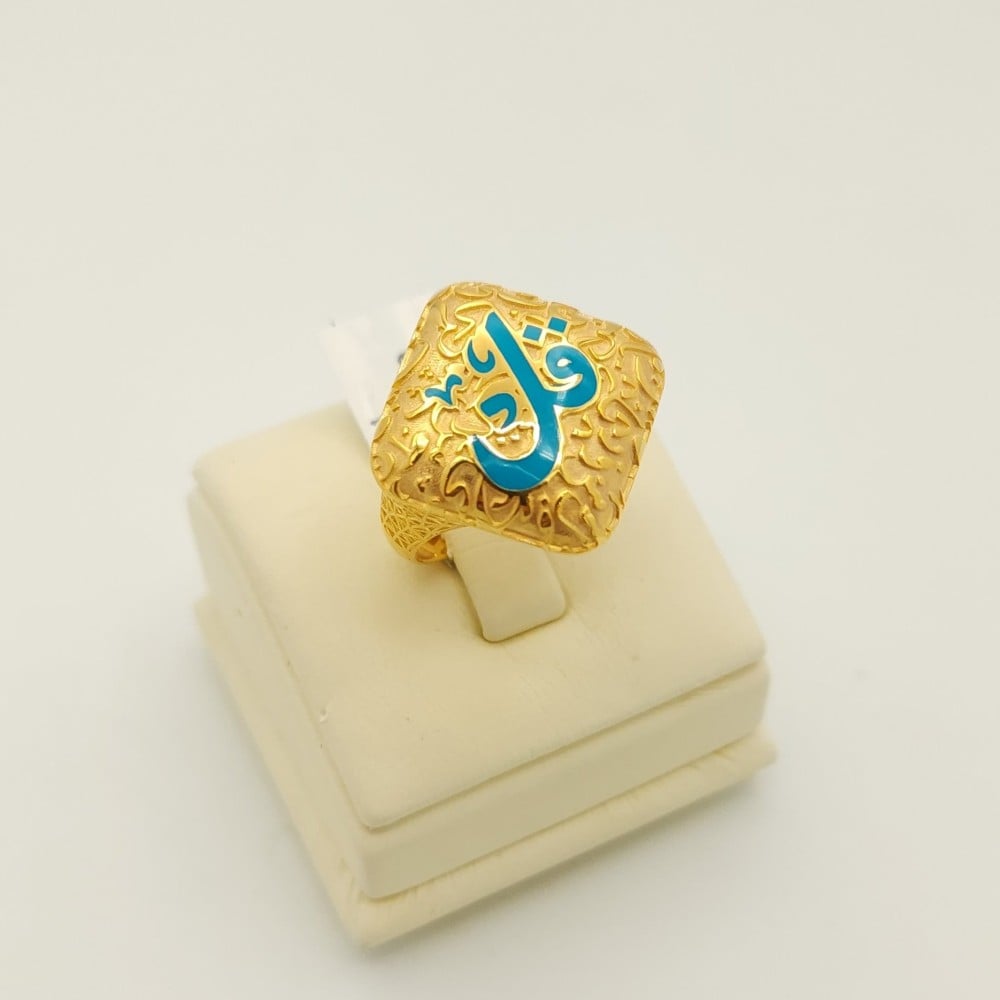 الهيكل الخارجي للخاتم مصنوع من الذهب الأصفر عيار 21، مما يضمن لك جودة عالية ومظهرًا لامعًا يجذب الأنظار. تصميمه الفريد يتضمن تفاصيل دقيقة تعكس براعة الصنعة، مع لمسات من الصبغ الأزرق التي تضيف لمسة من الألوان الجذابة. شكل الخاتم مربع مع زوايا مريحة، مما يجعله سهل الاستخدام ويعزز من جاذبيته.
