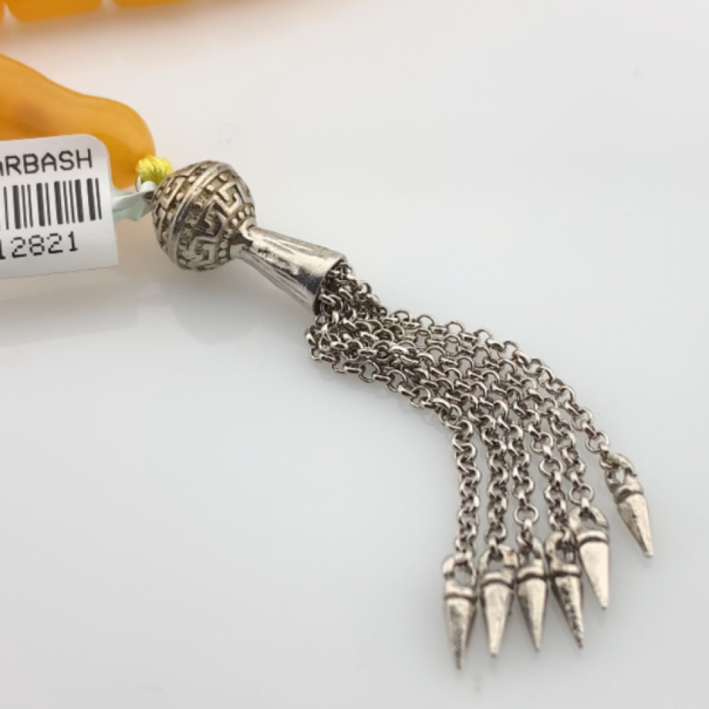 تتميز السبحة بتفاصيل دقيقة، حيث تتكون من خرزات مستطيلة الشكل، مما يمنحها شكلًا جذابًا وسهل الاستخدام. الأبعاد التقريبية للسبحة تجعلها مريحة في اليد، مما يساعد على استخدامها لفترات طويلة دون تعب. مع وجود خيوط فضية أنيقة تتدلى من نهاية السبحة، فإنها تضيف لمسة من الرقي إلى التصميم العام.