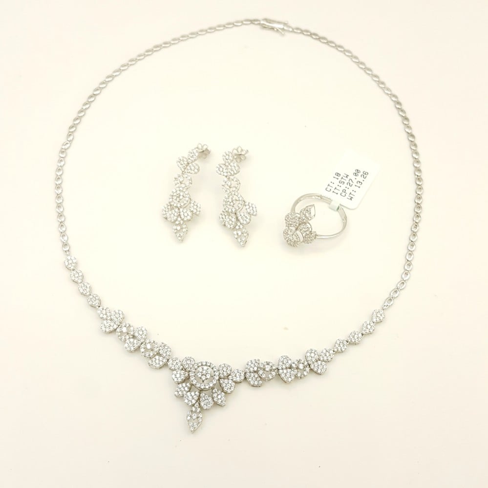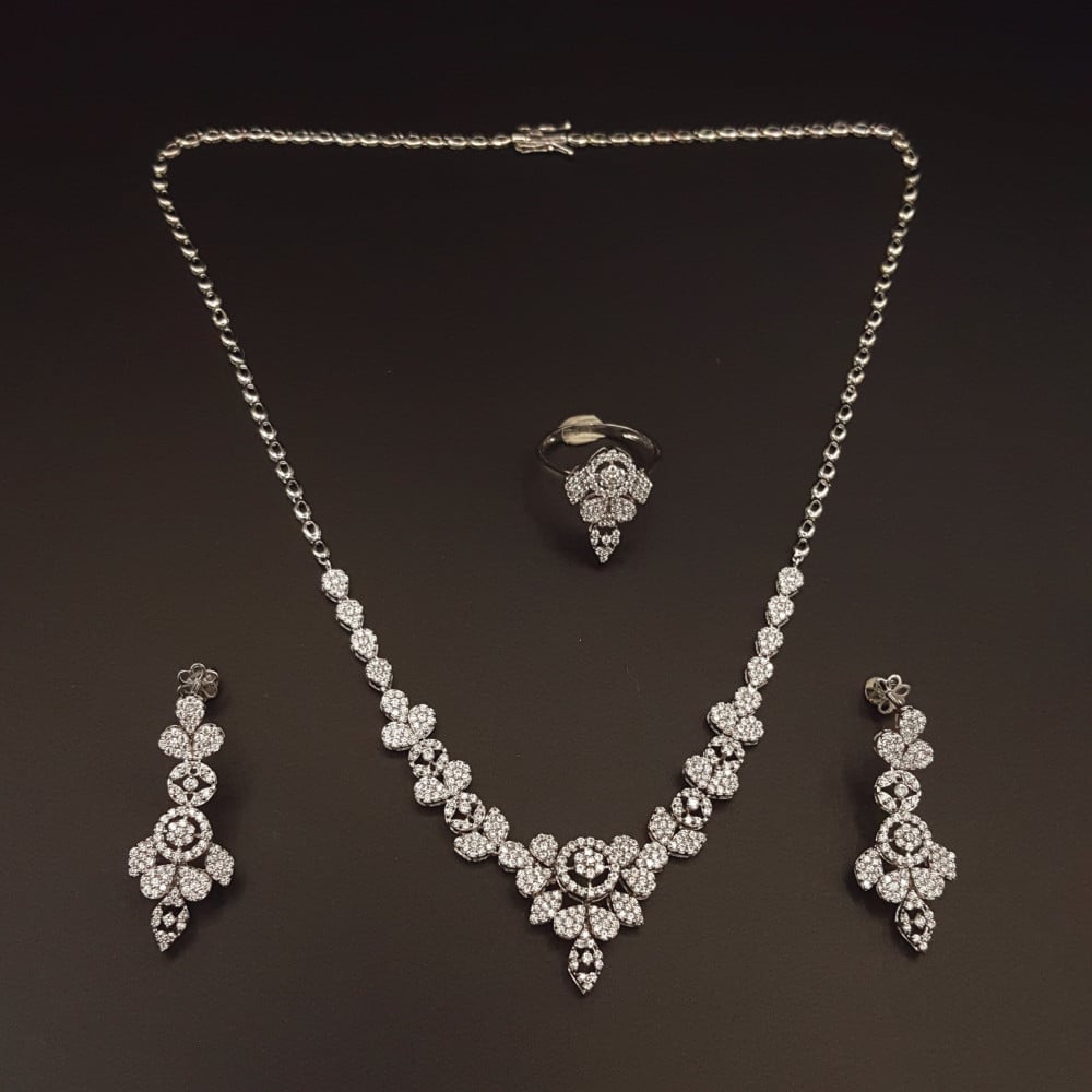 تتكون المجموعة من قلادة رائعة، وأقراط مميزة، وخاتم أنيق، جميعها مصممة بتفاصيل دقيقة تعكس مهارة الحرفيين. يتميز التصميم بأشكال متداخلة تشبه الأزهار، مما يمنح الطقم طابعاً فريداً وجذاباً. القلادة تتدلى برقة حول العنق، بينما تضفي الأقراط لمسة من التألق على الأذنين، والخاتم يكمل الإطلالة بأناقة.
