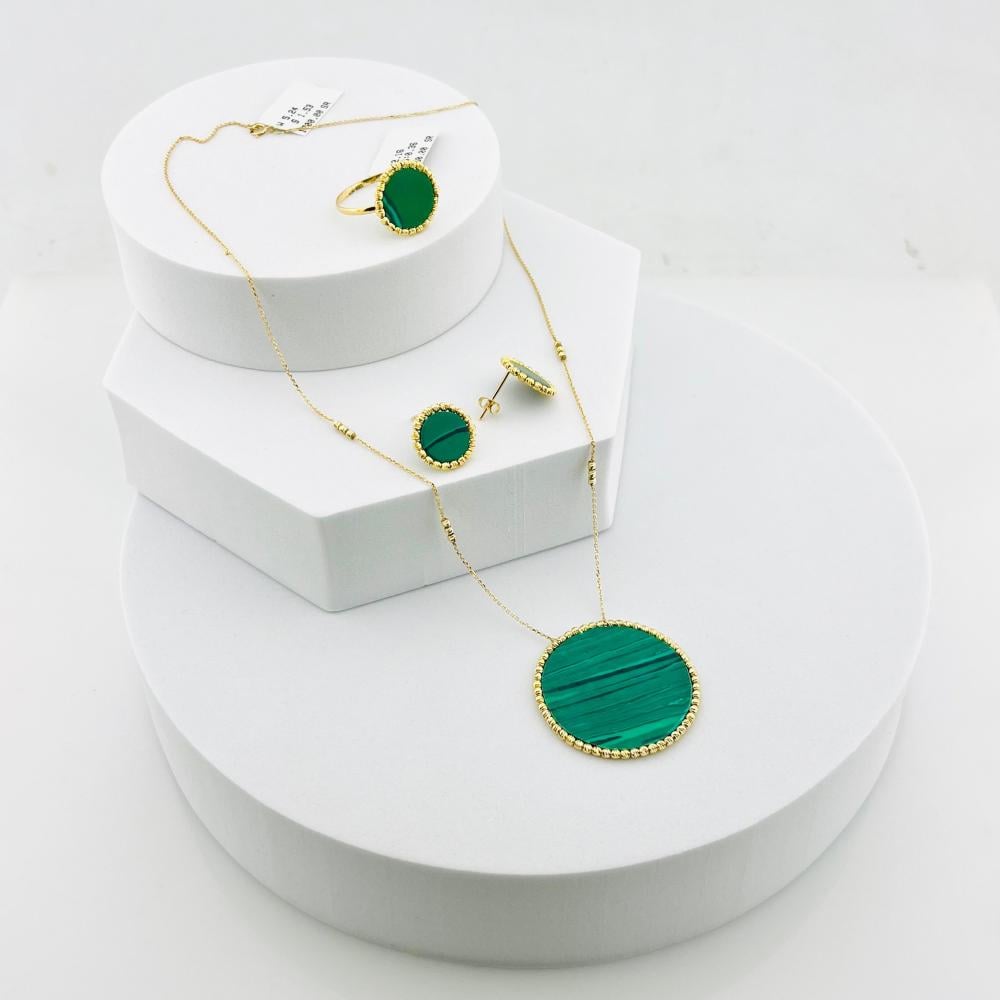 لا تفوتي فرصة اقتناء طقم ذهب عيار 18 مع حجر أخضر الذي يجمع بين الأناقة والجودة. اجعليه جزءًا من مجموعتك اليوم وكوني دائمًا في قمة التألق!