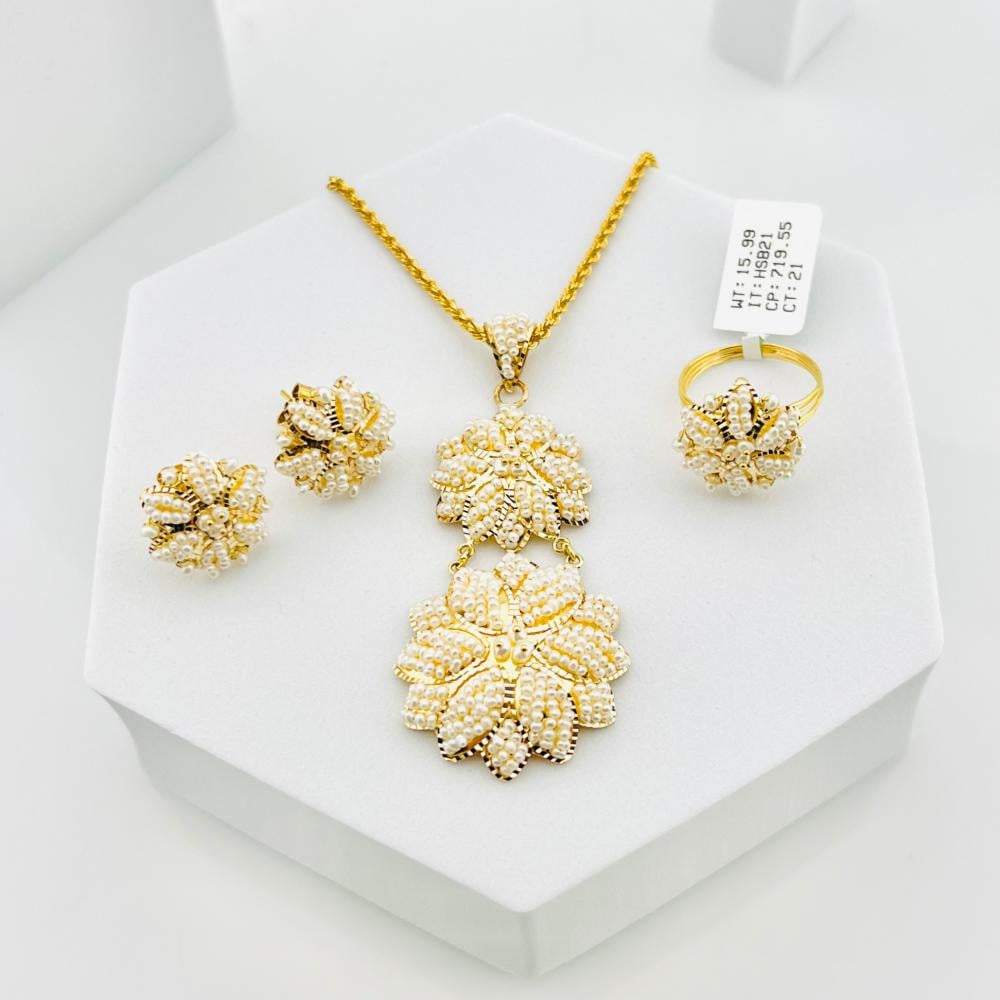استمتع بأناقة لا مثيل لها مع طقم ذهب لؤلؤ بحريني عيار 21، الذي يزن 20.53 جرام. يتميز تصميمه الزهري الرائع بجمال فريد يجمع بين الفخامة والتميز. إن هذا الطقم هو الخيار المثالي لمن تبحث عن لمسة من الفخامة في إطلالتها اليومية أو في المناسبات الخاصة.