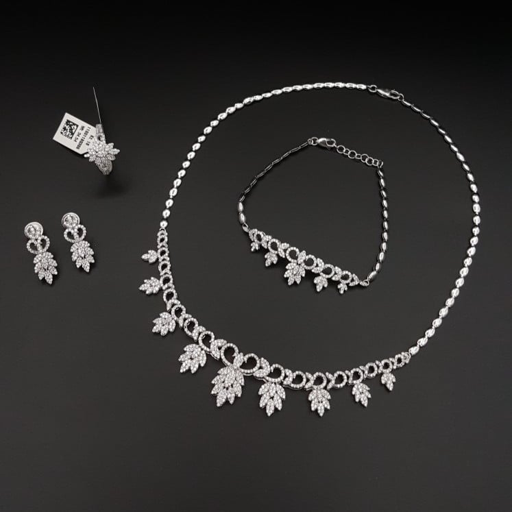 - تصميم راقٍ: يتكون الطقم من قلادة، أقراط، وخاتم بتصميم مميز، حيث تتألق الألماس في كل قطعة.