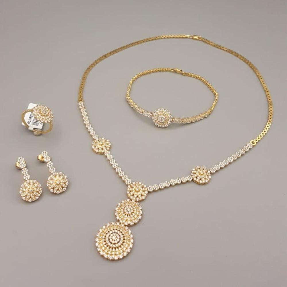 يتكون الطقم من قلادة رائعة، أساور أنيقة، أقراط مبهرة، وخاتم جذاب، حيث تم اختيار كل قطعة بعناية فائقة لتكمل بعضها البعض. يتميز الذهب بلمعانه الدافئ ولونه الغني، مما يضفي لمسة من الفخامة على إطلالتك. تتكون القطع من تصميم دائري مزين بأحجار لامعة، مما يجعلها تتلألأ في الضوء وتلفت الأنظار.