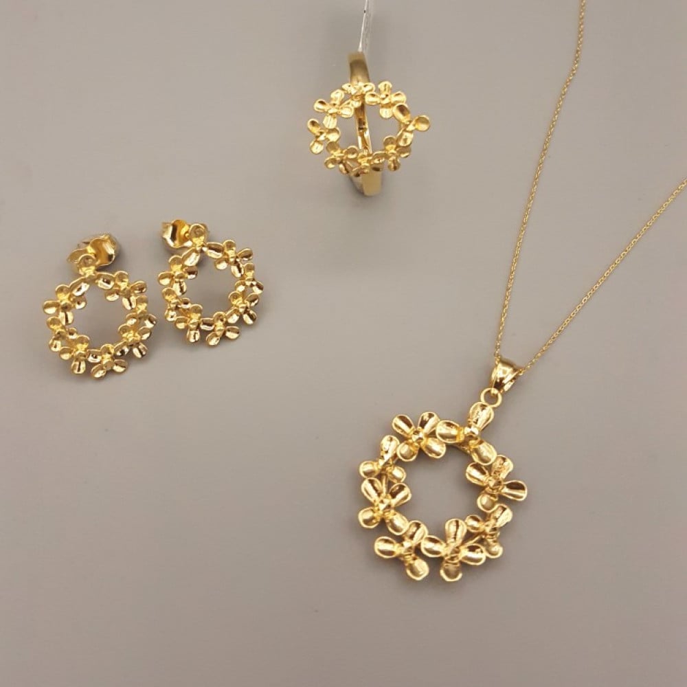 يتميز الطقم بتصميمه الفريد الذي يجمع بين الأشكال الدائرية والتفاصيل الرقيقة، مما يخلق مظهرًا جذابًا. تم تصنيع القطع من ذهب عيار 18، مما يضمن لك جودة عالية ولمسة ناعمة. يتكون الطقم من قلادة رائعة وأقراط متناسقة، حيث تتداخل الأشكال الزهرية بشكل فني، مما يضفي لمسة من الحيوية والأنوثة.