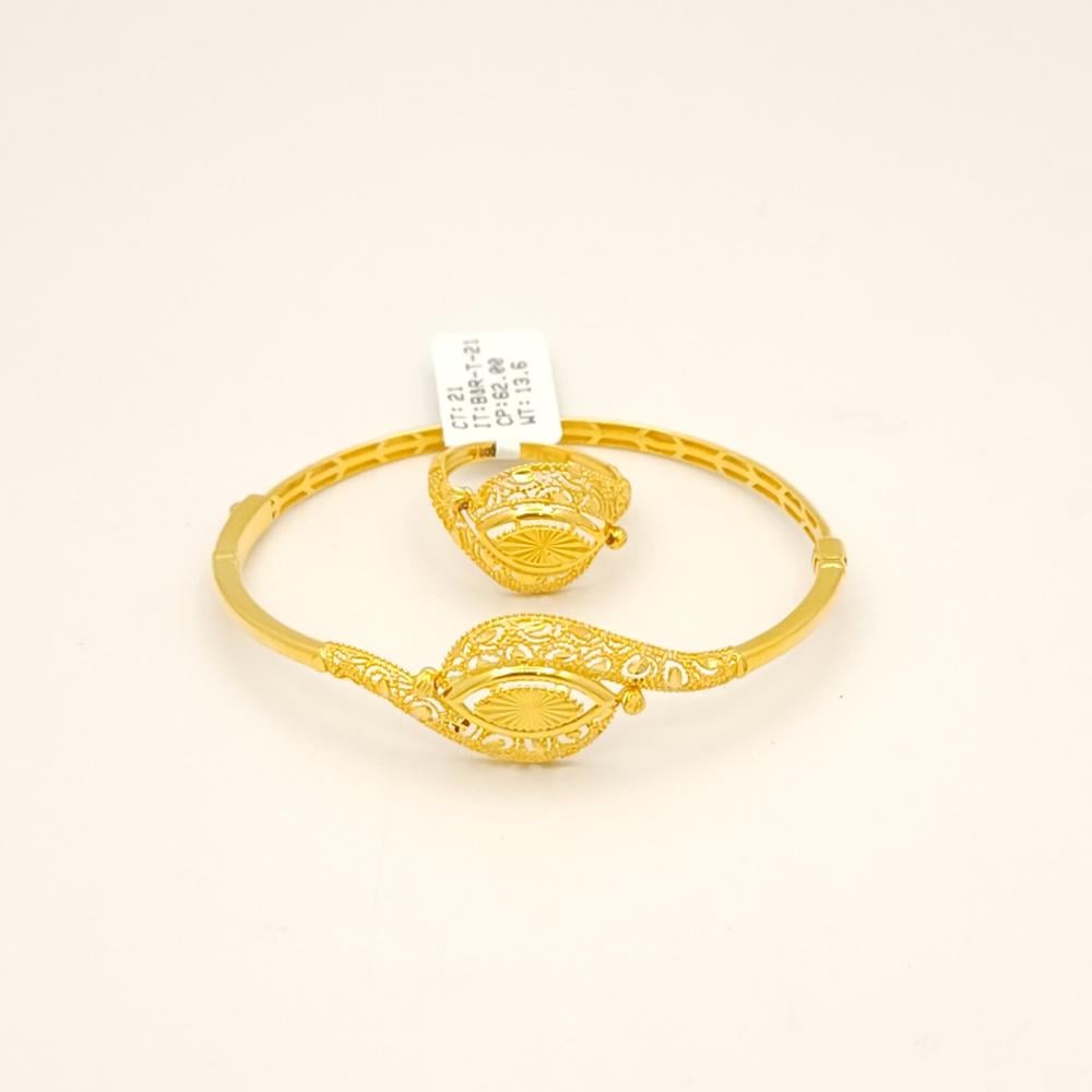 تأتي الاسورة والخاتم بلون ذهب لامع، مما يمنحها مظهرًا جذابًا يعكس الضوء بشكل رائع. التصميم مزخرف بنقوش دقيقة تضيف لمسة فنية، مما يجعل كل قطعة فريدة من نوعها. تتميز الأسورة بوجود منحنيات سلسة وأطراف مريحة، مما يجعلها سهلة الارتداء طوال اليوم.