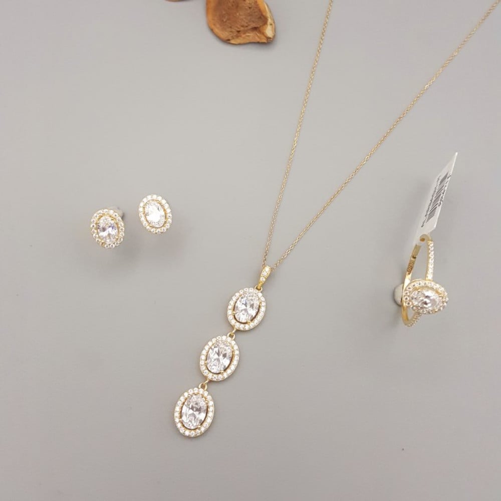 - تصميم أنيق: يتكون الطقم من عقد متدلي وأقراط مميزة، حيث يتزين العقد بثلاث قطع بيضاوية محاطة بأحجار لامعة، تعكس الضوء بشكل رائع.
