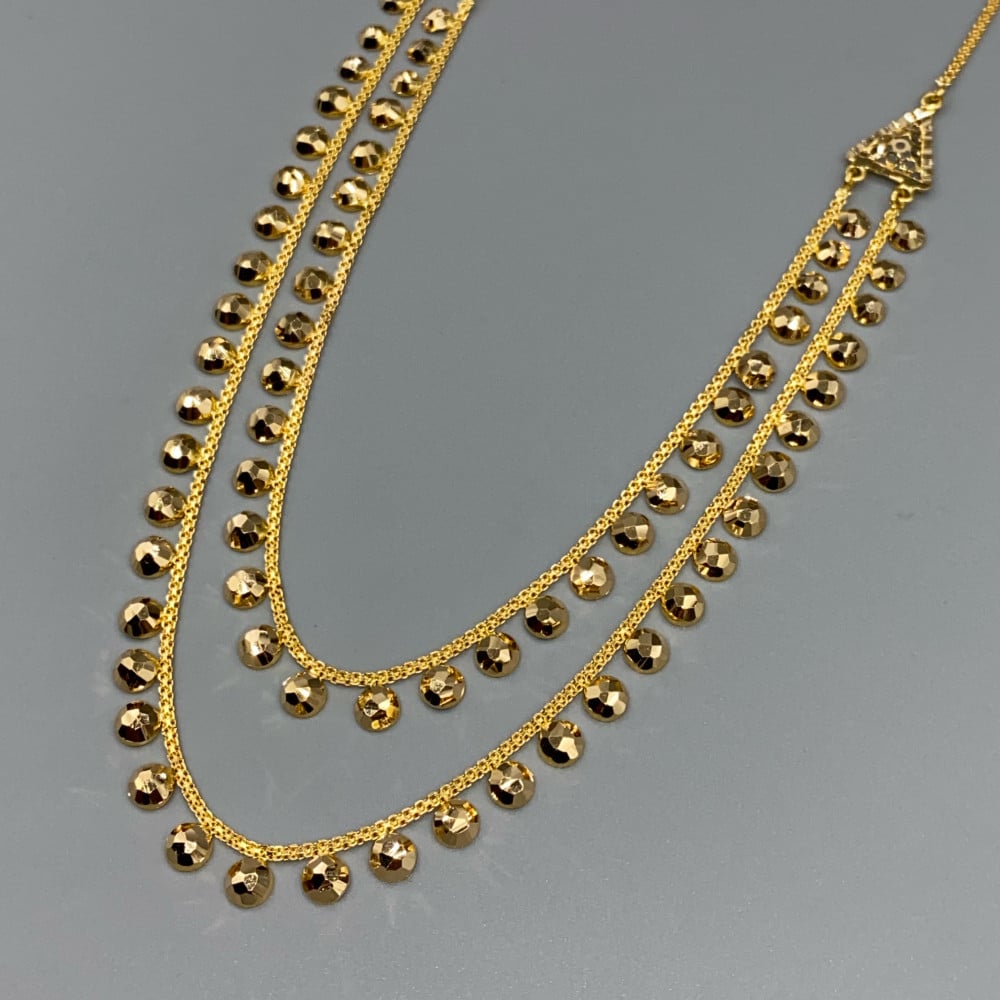 - تصميم فريد: تتكون القلادة من سلسلتين متداخلتين، مما يضفي عمقًا وجمالًا على مظهرك. تتدلى كرات ذهبية لامعة على طول السلسلتين، مما يعكس الضوء بطريقة رائعة.