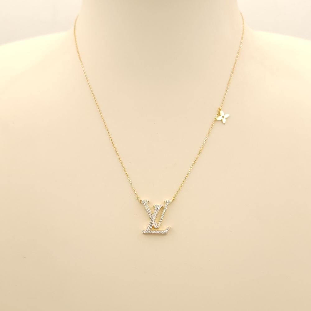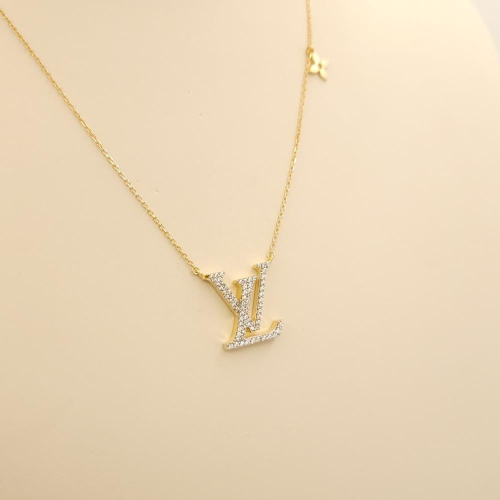تأتي القلادة بلون ذهبي لامع، حيث يعكس الضوء بشكل رائع، مما يجعلها تبرز في أي مناسبة. تتميز بتصميم أنيق يتضمن حرف "LV" المزين بحبات من الألماس اللامع، مما يضيف لمسة من الفخامة والجاذبية. السلسلة رقيقة ولكن متينة، مما يضمن راحة الاستخدام طوال اليوم.