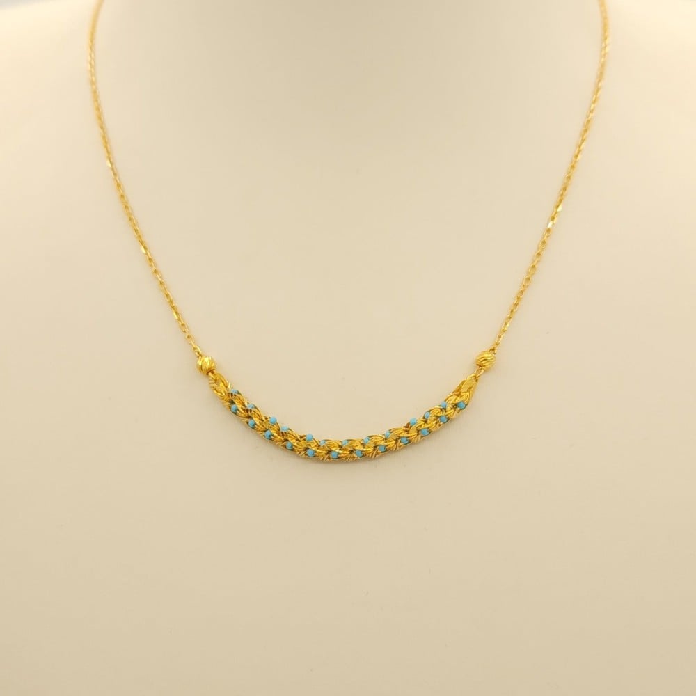 - الألوان: تتميز القلادة بألوان زاهية تتناغم مع الذهب الأصفر، مما يجعلها تبرز بشكل رائع على البشرة.