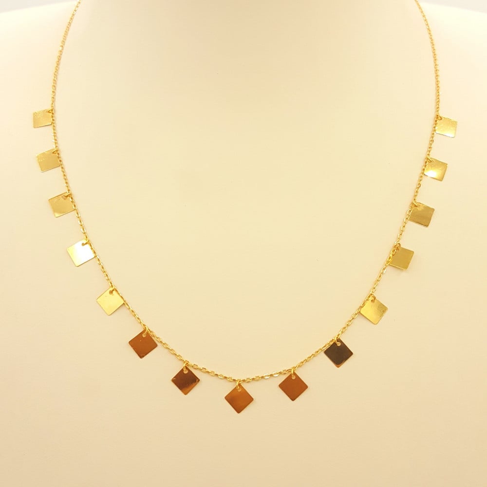 - تصميم هندسي: تحتوي القلادة على قطع مربعة صغيرة تتدلى بشكل متناسق، مما يضيف لمسة عصرية وجذابة.