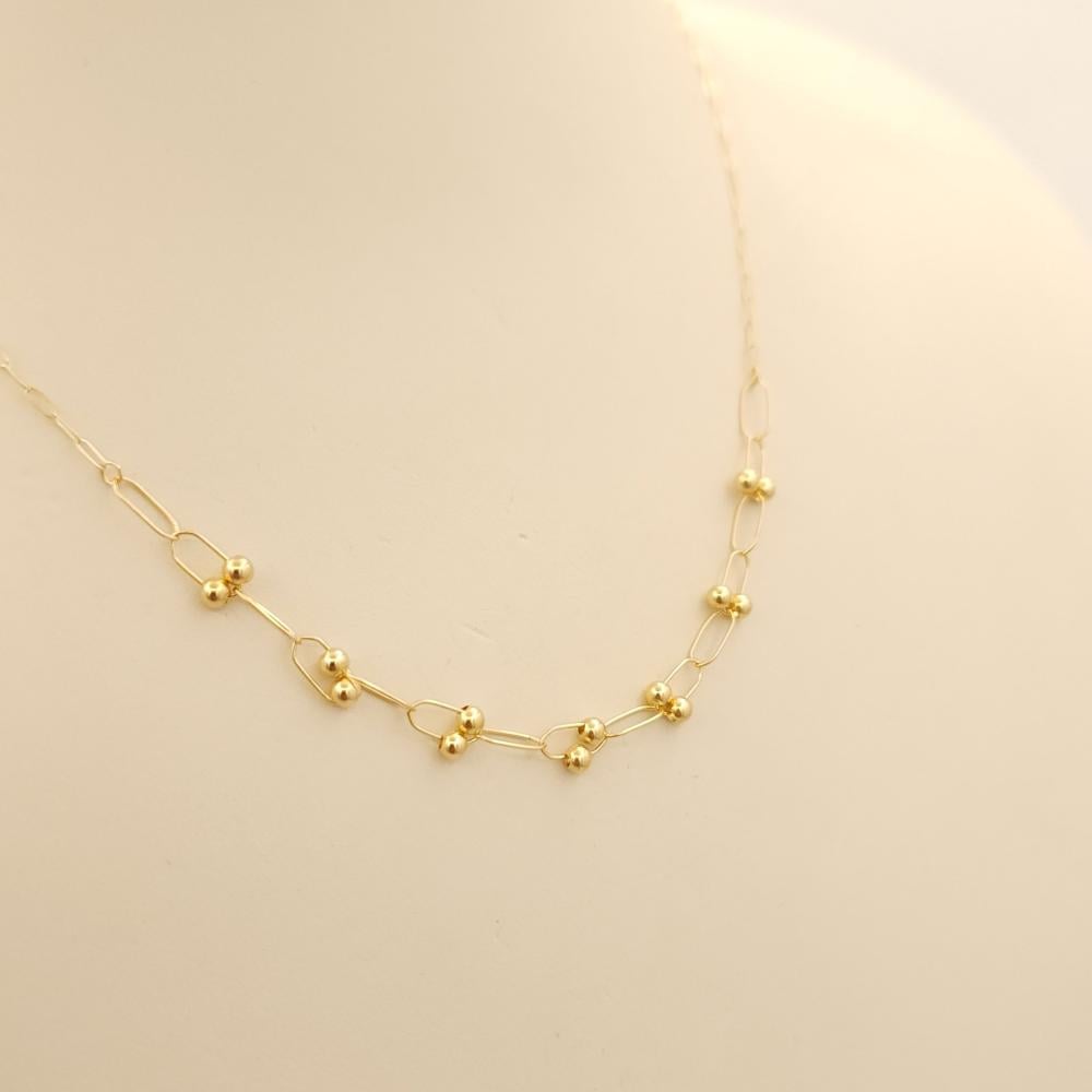 - تصميم مميز: تتميز القلادة بتصميمها السلس الذي يتكون من سلسلة رقيقة مع كرات ذهبية صغيرة، مما يضيف لمسة من الأناقة والتميز.