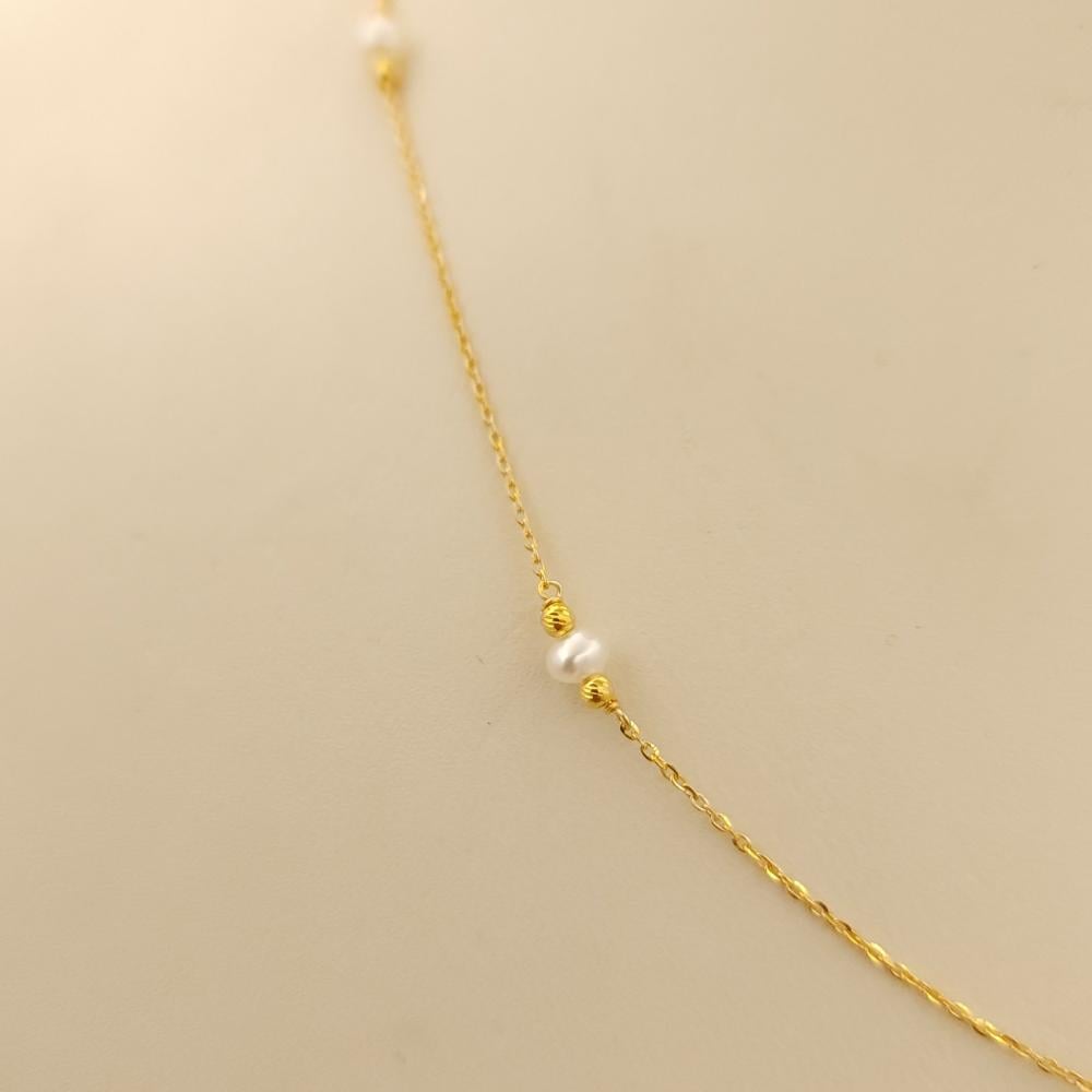 - تصميم أنيق: تتميز القلادة بتصميم سلس مع حبات لؤلؤ متناثرة، مما يخلق توازناً جميلاً بين البساطة والفخامة.
