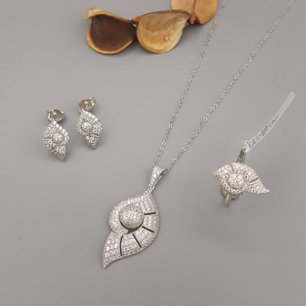 - تصميم فريد: يتكون من قلادة وأقراط وخاتم بتصميم عصري وأنيق، مع تفاصيل دقيقة تبرز جماله.