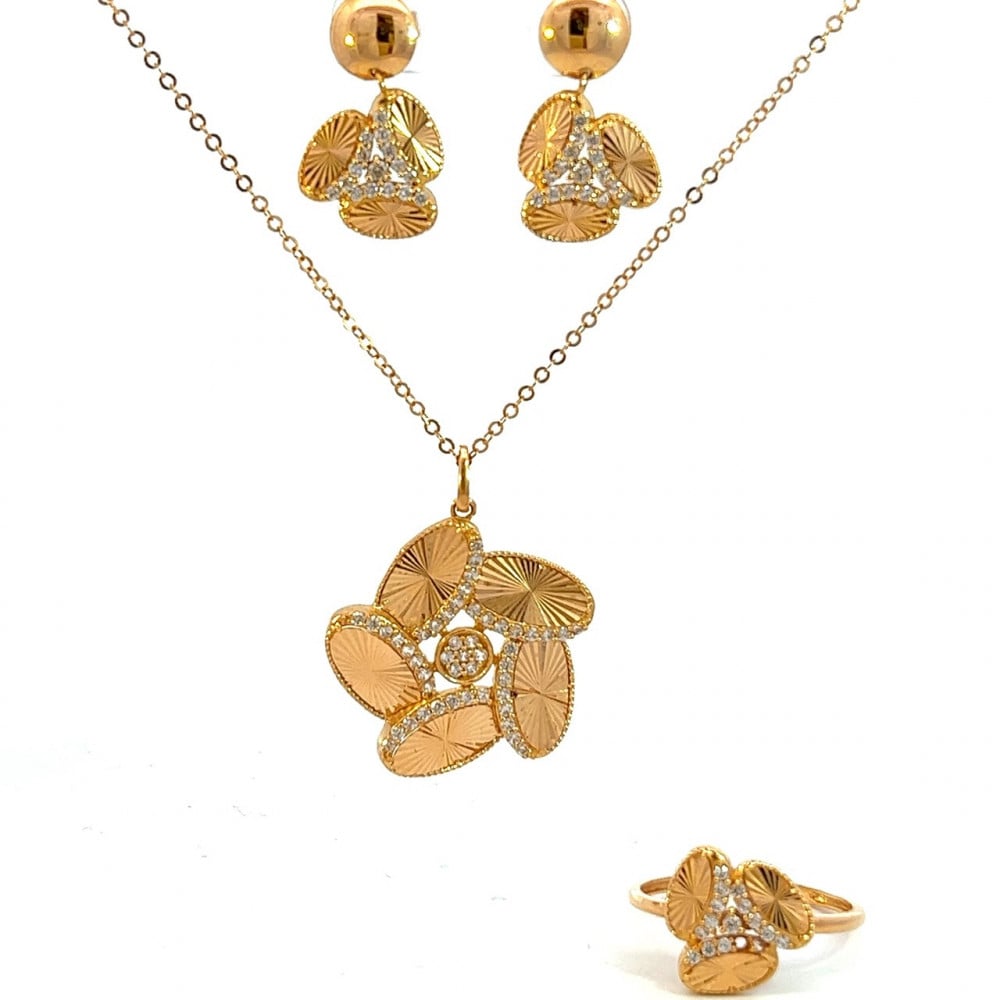 تتضمن المجموعة قلادة أنيقة مع تصميم زهور متداخلة، حيث تبرز الألوان الذهبية اللامعة مع تفاصيل دقيقة تضيف لمسة من الفخامة. كما أن الأقراط تتناغم بشكل مثالي مع القلادة، مما يجعلها خياراً رائعاً للتنسيق مع أي ملابس.