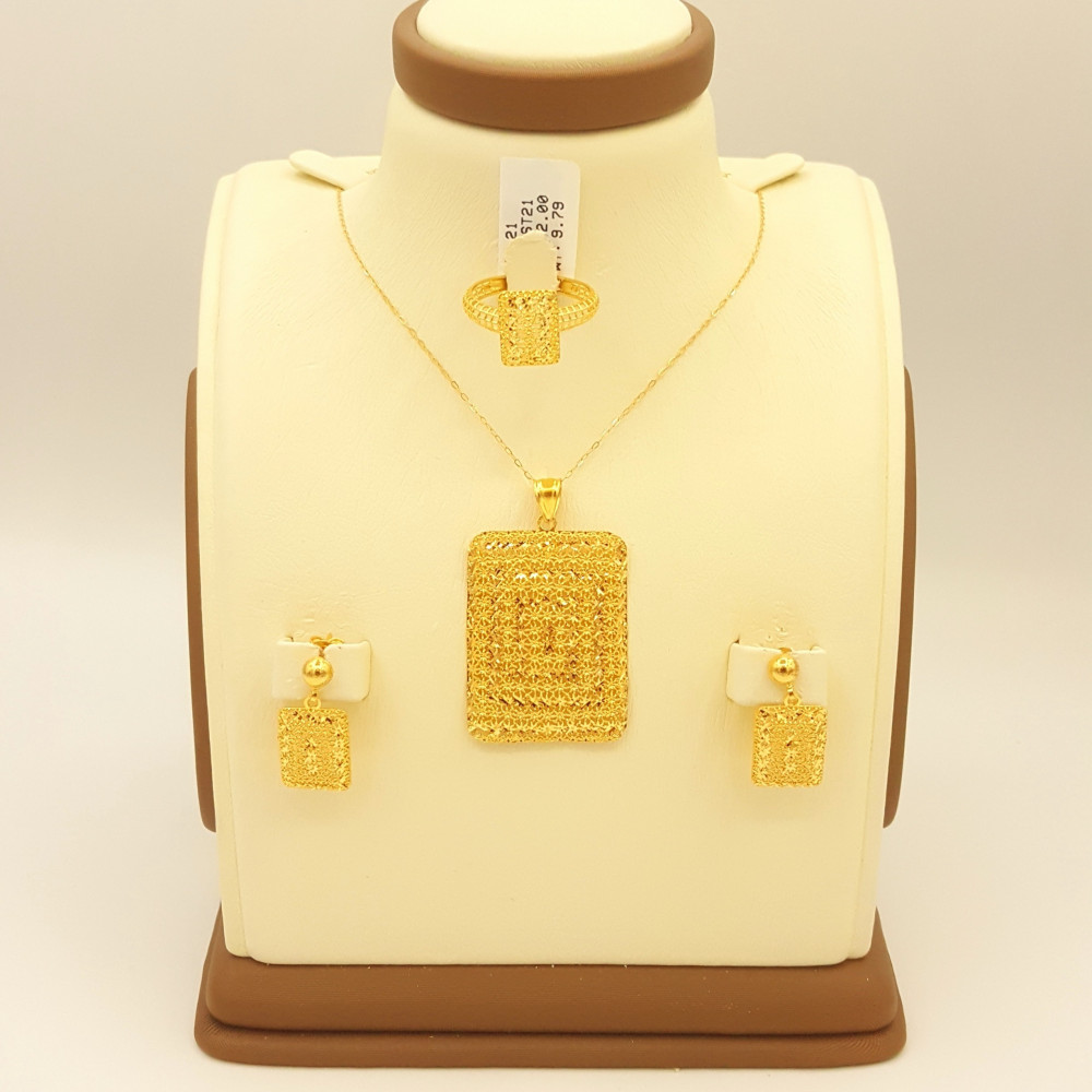 استمتع بتألق وسحر هذا الطقم المميز من الذهب عيار 21 المنقوش، ودعه يكون رمزًا للتفرد والأناقة الخالدة في إطلالتك. لا تفوت الفرصة، احصل عليه الآن وأضف لمسة من الفخامة إلى حياتك!