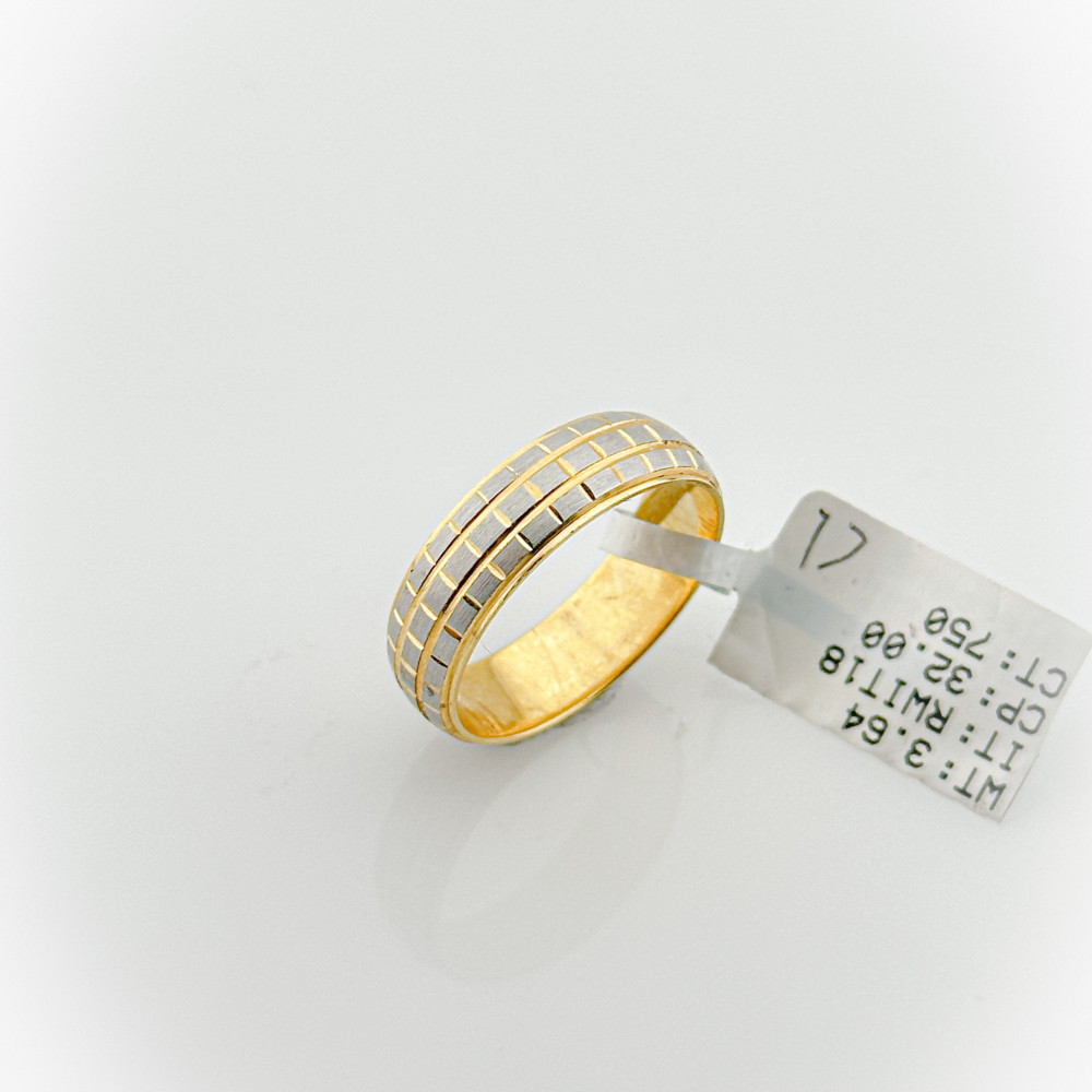 The ring comes in a shiny gold color, which gives it a touch of luxury. It is made of high-quality materials, which is evident in the soft touch and shiny appearance. The design includes a precise geometric pattern, with parallel lines that give it a modern and attractive character.
