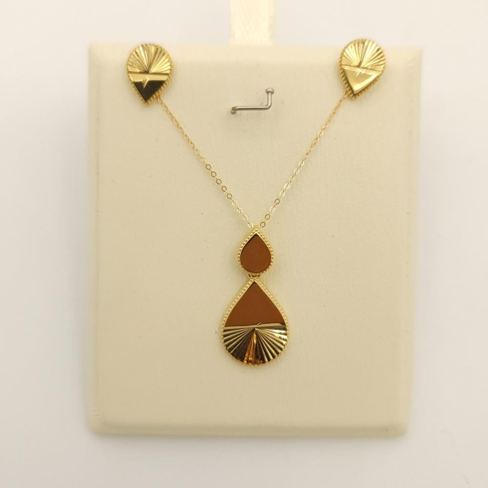 تتميز القطع بتصميم فريد يجمع بين الأشكال الدائرية والزوايا الناعمة، مما يضفي لمسة عصرية. كما أن اللون الذهبي اللامع يبرز جمال الطقم، مما يجعله يلفت الأنظار. يمكن أن يتناسب هذا الطقم مع مختلف الأزياء، سواء كانت ملابس رسمية أو غير رسمية، مما يجعله خياراً متعدد الاستخدامات.