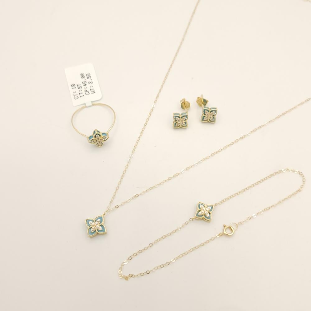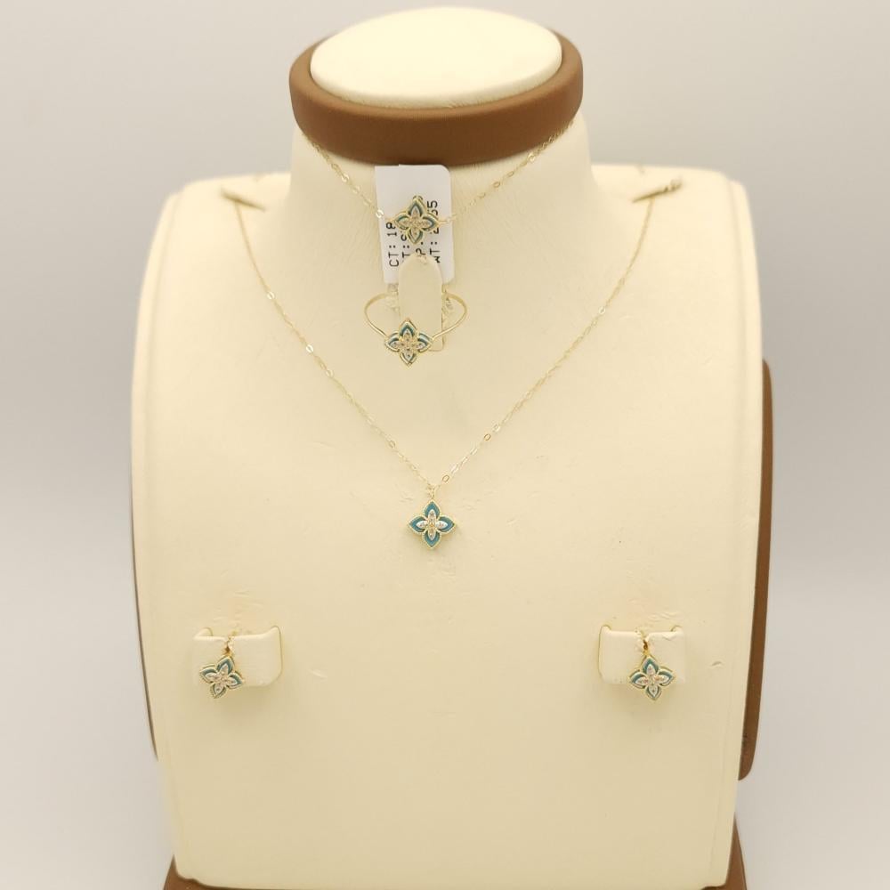 اكتشفوا أناقة طقم مجوهرات ذهب عيار 18 بتصميم عالمي، وزن 2.55 جرام. يتميز هذا الطقم بجودة استثنائية وفخامة لا مثيل لها، مما يجعله خيارًا مثاليًا لإضافة لمسة من الرقي إلى إطلالتكم.