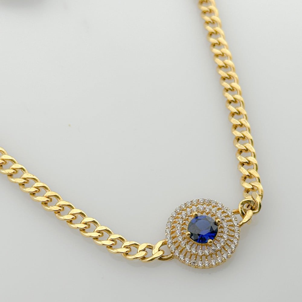 This piece is meticulously detailed and crafted from 18k gold, ensuring high quality and long-lasting durability. The elegant gold chain adds a touch of sophistication, while the sparkling blue stone is framed by a bezel set with tiny stones to enhance its appeal.