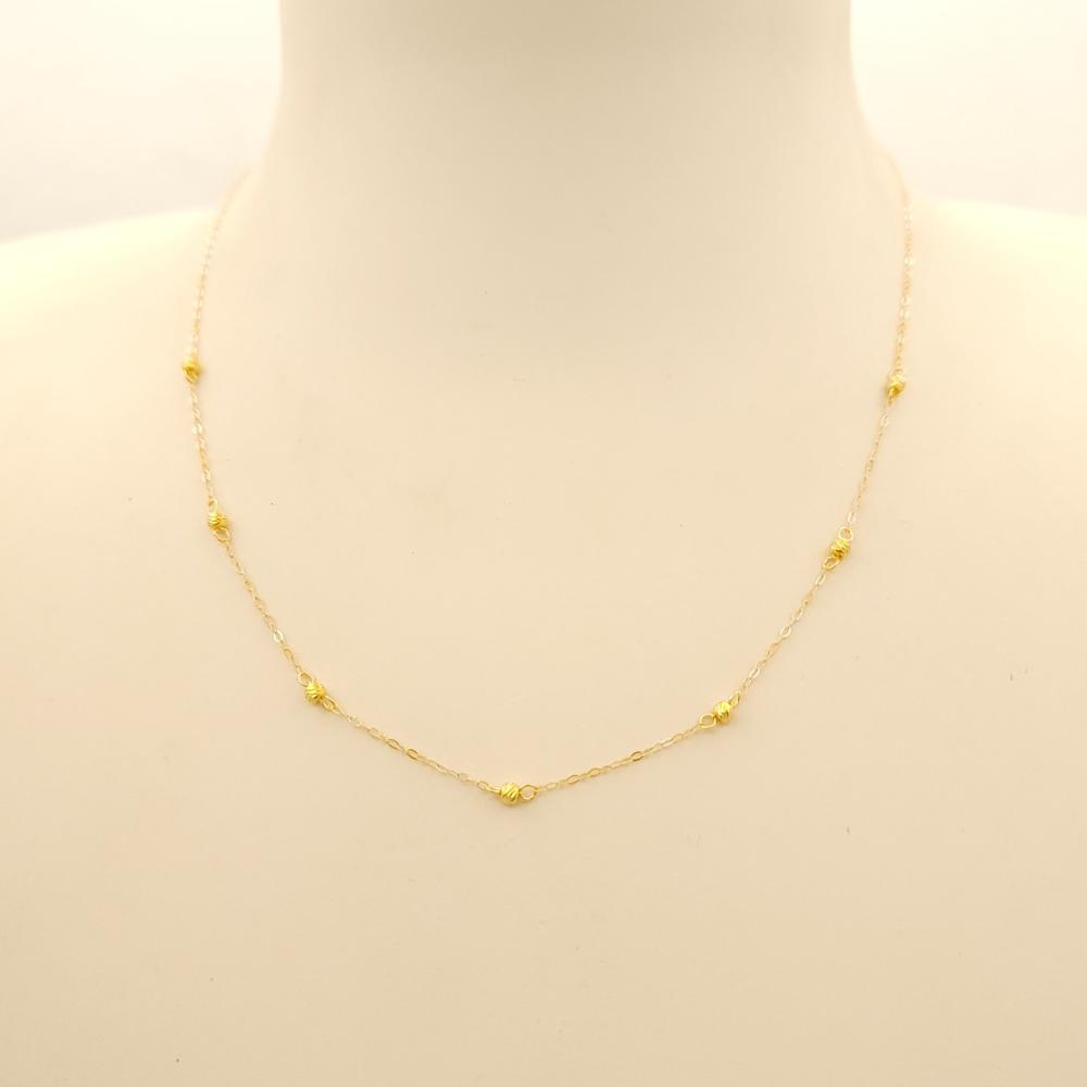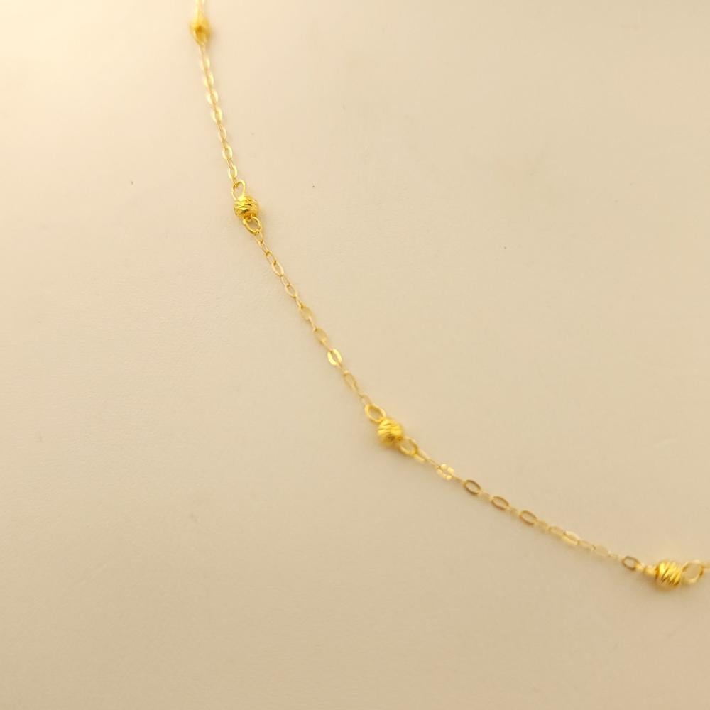 Discover the elegance of this 21-karat gold necklace weighing 1.34 grams, a unique design that highlights your beauty! This necklace features a shiny gold hue that adds a touch of luxury to your look. The design consists of a delicate chain adorned with tiny gold balls, creating an attractive contrast between shine and softness.