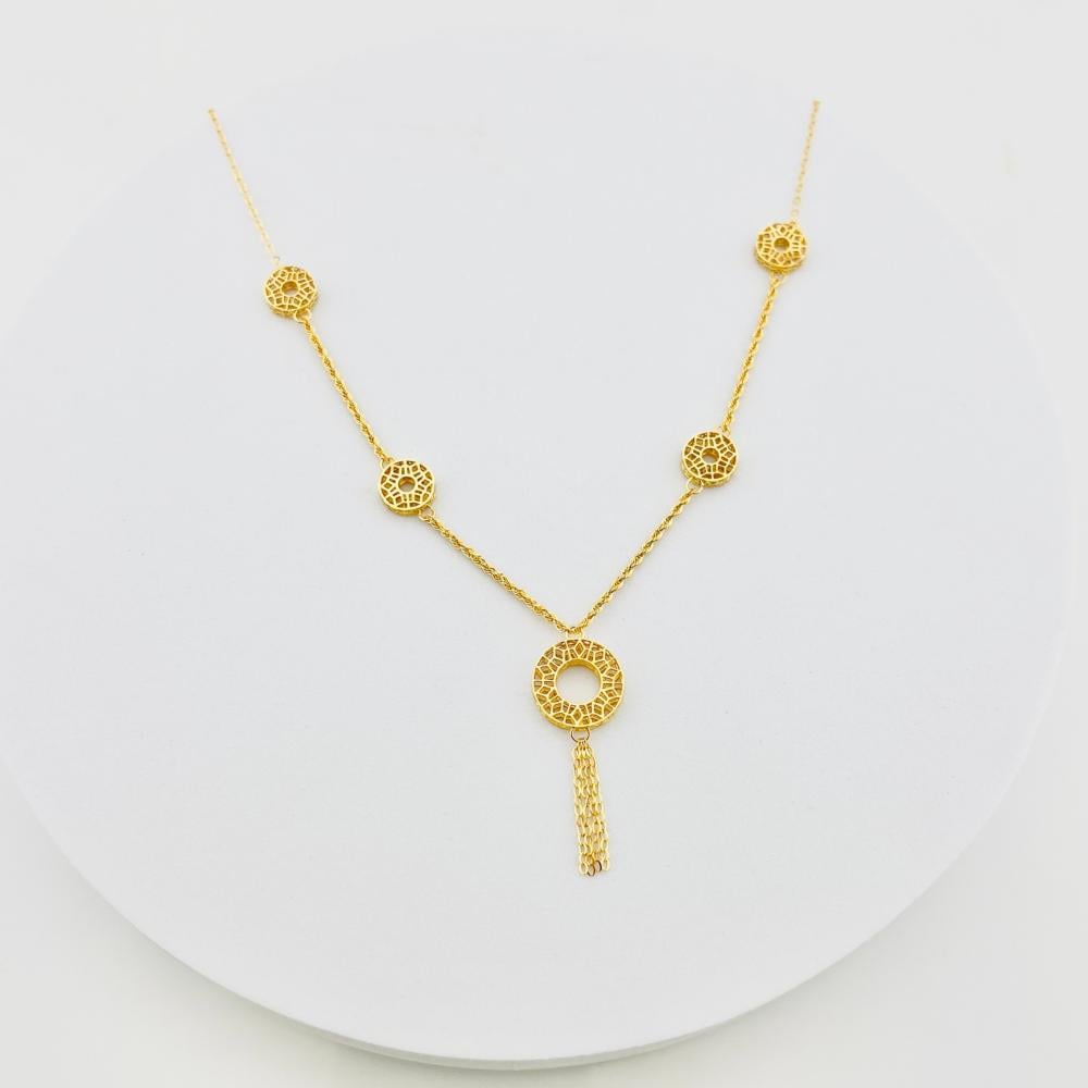 - تصميم فريد: تتكون القلادة من سلسلة رقيقة من الذهب عيار 21، مزينة بخمسة عناصر دائرية متداخلة، مما يضيف لمسة من الفخامة.