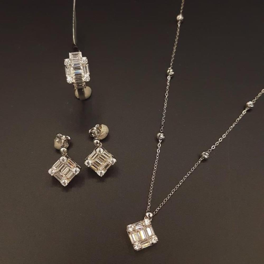 The set features an elegant design that combines the dazzling brilliance of diamonds with the softness of white gold, adding a touch of luxury to your look. The colors used in this set are shiny and transparent, ensuring that each piece catches the light in an amazing way. The materials used in the manufacturing also reflect high quality, as 18-karat gold was used, which is durable and reliable.