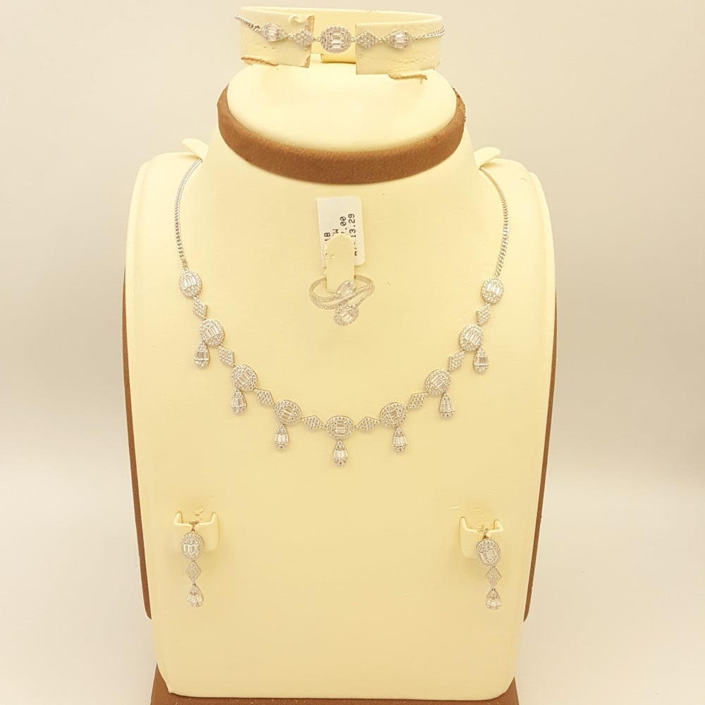 The set features intricate details crafted from 18k white gold, giving it a stunning shine and unparalleled brilliance. Its elegant design includes a stunning necklace with touches of sparkling stones, attractive dangling earrings, and a ring that adds a touch of sophistication. Each piece in this set is meticulously crafted to reflect the artistry of skilled craftsmen, making it an ideal choice for those seeking distinction.